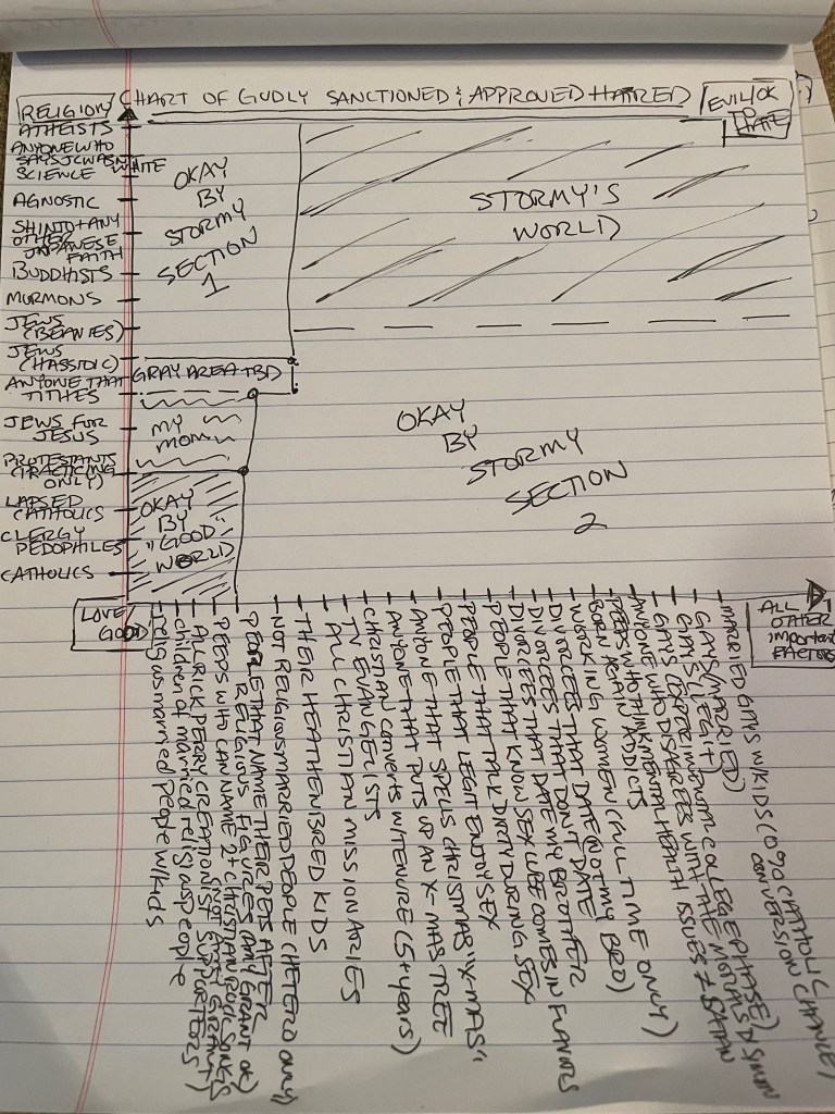 The bigger offense was Rem&Jess. Even though we. are. sinners. Pete is concerned that his brother’s tunnel vision right wing world vision means that Simon will consider interacting with lesbians – who treat us with love and acceptance of family – will be fair game for rudeness. Pete is worried about offending our friends by his brother’s potential embarrassing behavior. Apparently I missed the Sunday school week where you learn about which categories of folks it is okay to hate – which is a shame because I still haven’t been able to figure it out despite my best analytical charting efforts: